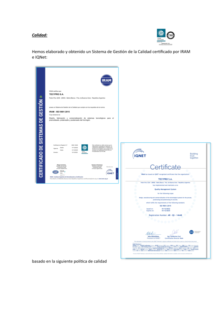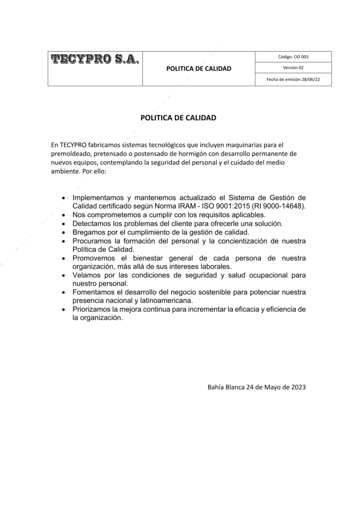 Tecnologías y Proyectos S.A. Diseño, fabricación e instalación de equipos para producción de piezas pretensadas y postensadas. Nuestros Servicios Tecnologías y Proyectos S.A. Diseño, fabricación e instalación de equipos para producción de piezas pretensadas y postensadas. Mira Nuestros Servicios Productos EQUIPOS PARA FÁBRICAS PERFILADORAS SISTEMA LONG LINE PLANTAS LLAVE EN MANO Certificación NORMA ISO 9001:2015 TECYPRO S.A. se encuentra en la actualidad con Certificación de la Norma ISO 9001:2015 ( Control de Calidad )